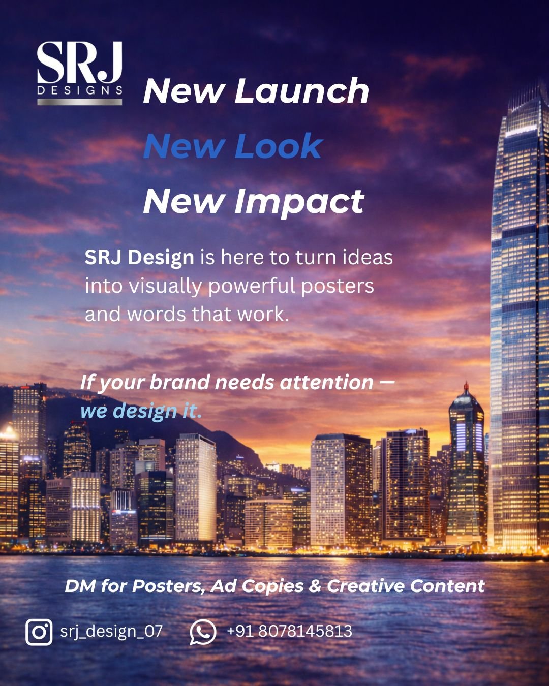 SRJ Designs established on 15th February 2026. SRJ Designs delivers visually powerful posters and persuasive ad copies that capture attention and drive real results. We believe that great design is more than aesthetics — it’s communication with purpose. Every visual we create and every word we craft is strategically designed to speak to your audience, strengthen your brand identity, and inspire action. We understand that in today’s fast-paced digital world, attention is currency. That’s why we focus on clarity, creativity, and emotional connection. Whether you’re a start-up building your presence or an established brand looking to elevate your image, we create posters, ad copies, and creative content that stand out in crowded spaces and resonate with the right audience.